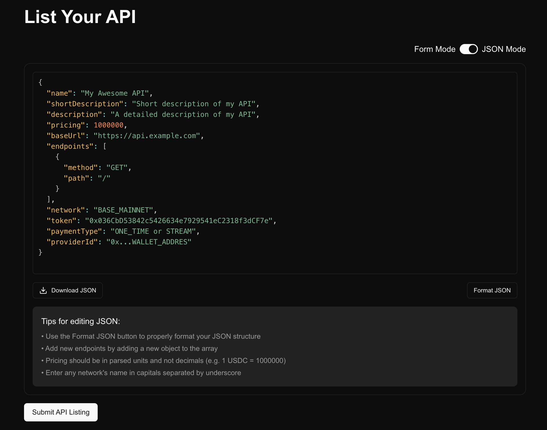 Prepare a POST request with the body containing details of your API and the endpoint you support along with the payment information: